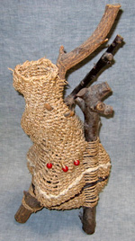 Nest No. 1, (1994) size: 20" tall, 11" diam. materials: seagrass, apricot wood, wood beads, handmade paper price: Private Collection, NFS I didn't see a connection between this form and bird nests until some time after completion. At the time I was simply making my vessels more and more organic, diverging from traditional forms. This piece also drew from materials on hand as the branches were from my backyard. I had used twisted paper in the past, but this was one of the first times I made it myself, using paper I had made from weaving scraps (mostly seagrass clippings from previous works). |