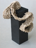 Tower No. 1, Black (2002) size: 9" tall, 6" diam. materials: Lego bricks, seagrass price: NFS This was the first piece I did weaving onto Lego bricks. I had previously used a similar approach to weaving onto a cardboard box, but I couldn't punch holes into the plastic like I had the cardboard. Using "Technics" Lego bricks, the holes were placed where they would be needed before weaving began. |