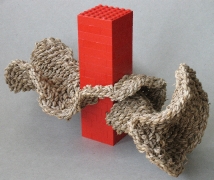 Tower No. 2, Red (2002) size: 7" tall, 12" diam. (widest) materials: Lego bricks, seagrass price: $200 This piece plays with balance by extending the weaving well away from the center tower, but asymmetrically. |
