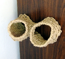 ARCHITECTURAL WEAVING Although I do many sculptural stand-alone pieces, my current passion is art installations. Because of the flexibility of the materials I work with, and the style I work in, I have found it suitable and affordable for private homes. I intend to do more large corporate and institutional installations and outdoor work, but right now I am available to create smaller pieces in your home while I build up my portfolio. These pieces are usually "growing" out of a piece of furniture (tables, desks, shelving, cabinets) or directly from the architecture (a wall, door, counter, ceiling, floor, railing). Not only can an architectural weaving be a very unique addition to the decor of your home, and possibly functional, but I want you to enjoy the experience of the work being created in your home. I welcome your questions and company while I work. Please contact me for availability and estimates. I am also happy to talk to interior designers or contractors about referrals. WHAT TO EXPECT If time permits, I usually have a meeting with you about a week before the actual weaving. At this first meeting, I see the actual location for the installation, take some photographs, and discuss size, materials, colors and any other concerns. I will also likely prepare a series of sketches of the piece. The reason for doing it a week before is so that I can order any special materials and prepare them (dying materials specific colors, for example). The weaving itself can almost always be done in one day, or less depending on size. I may need access to water if I need to work with any of the materials wet. For larger pieces, I may bring an assistant to help prepare materials while I weave. Of course if the weaving is being done on a removable item (like a cabinet door) I can take it and bring it back completed. This may make scheduling easier, but you miss out on the experience of seeing the piece being made. In special circumstances a piece can be done in a single meeting, but this limits color and material choices to what I can bring with me (or find on site!). I would want photos sent before the meeting and a discussion by phone. Many of my designs require drilling into the surface so that the weaving can be connected. These holes are sized to match the weaving material exactly and are covered by the body of the weaving so they are nearly invisible after the piece is completed. It is possible to do an installation without drilling, but this puts limitations on the location and final design. There are more possibilities for outdoor installations without drilling (on trees, fences, etc.) but weathering is more of an issue. I calculate the cost based on a flat fee for the size of the piece, plus cost of materials and estimated time. If travel time is small (if you live in San Francisco) then small pieces can start as low as $200-300. Most of my small and medium work comes in closer to $1000. Large pieces requiring special materials and preparation or longer travel can easily reach several thousand. Although I've been weaving for over twenty years, I've only been doing these installations sparsely for the past year. Please take advantage of this unique opportunity before my schedule fills up or I move on to other projects! |